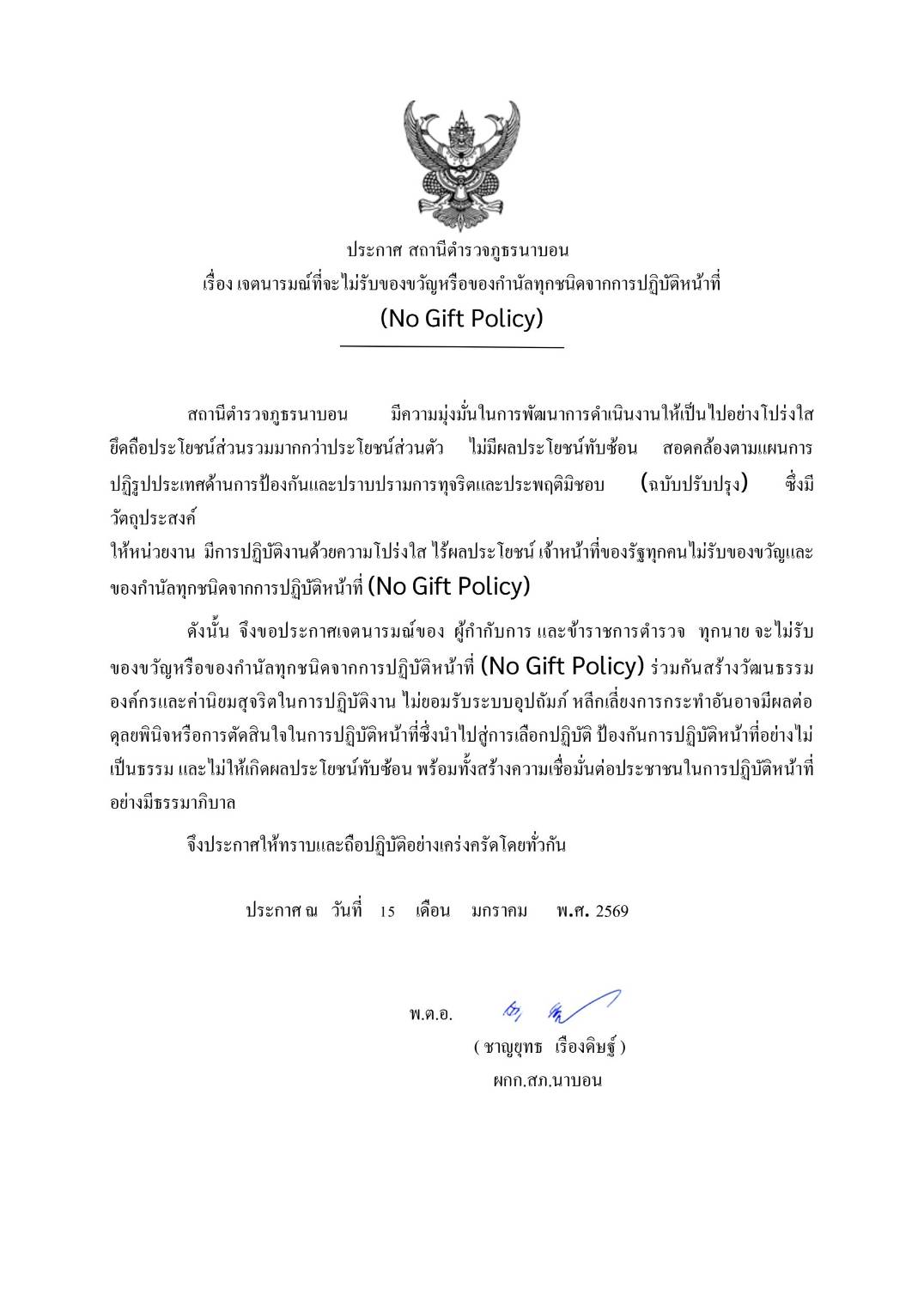 ประกาศ สถานีตำรวจภูธรนาบอน 14 มกราคม 202614 มกราคม 2026 สัจจะ นาบอน ข่าวประชาสัมพันธ์ ประกาศ สถานีตำรวจภูธรนาบอน เรื่อง เจตนารมณ์ที่จะไม่รับของขวัญหรือของกำนัลทุกชนิดจากการปฏิบัติหน้าที่ (No Gift Policy)
