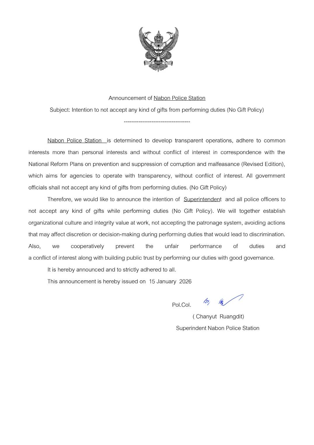 Announcement of Nabon Police Station 14 มกราคม 202614 มกราคม 2026 สัจจะ นาบอน ข่าวประชาสัมพันธ์ Announcement of Nabon Police Station Subject: Intention to not accept any kind of gifts from performing duties (No Gift Policy)