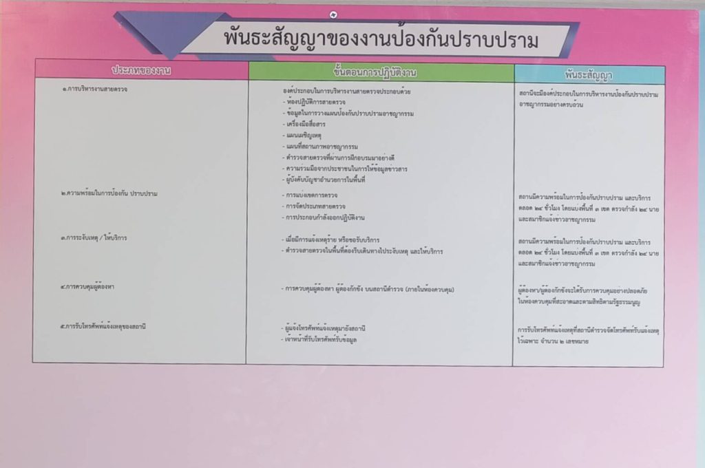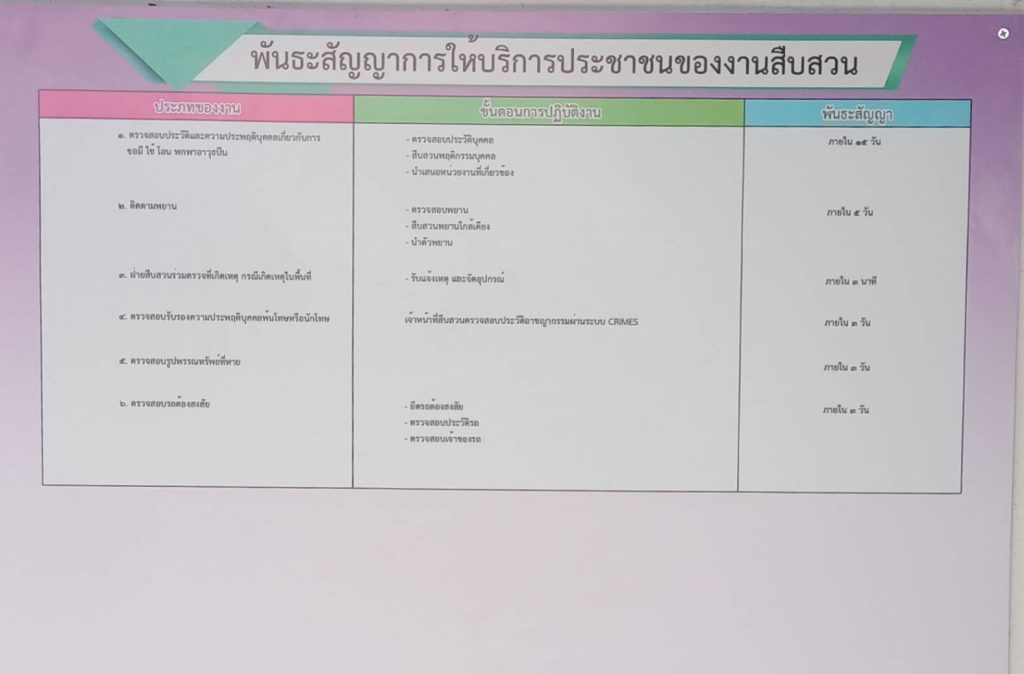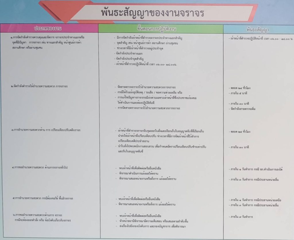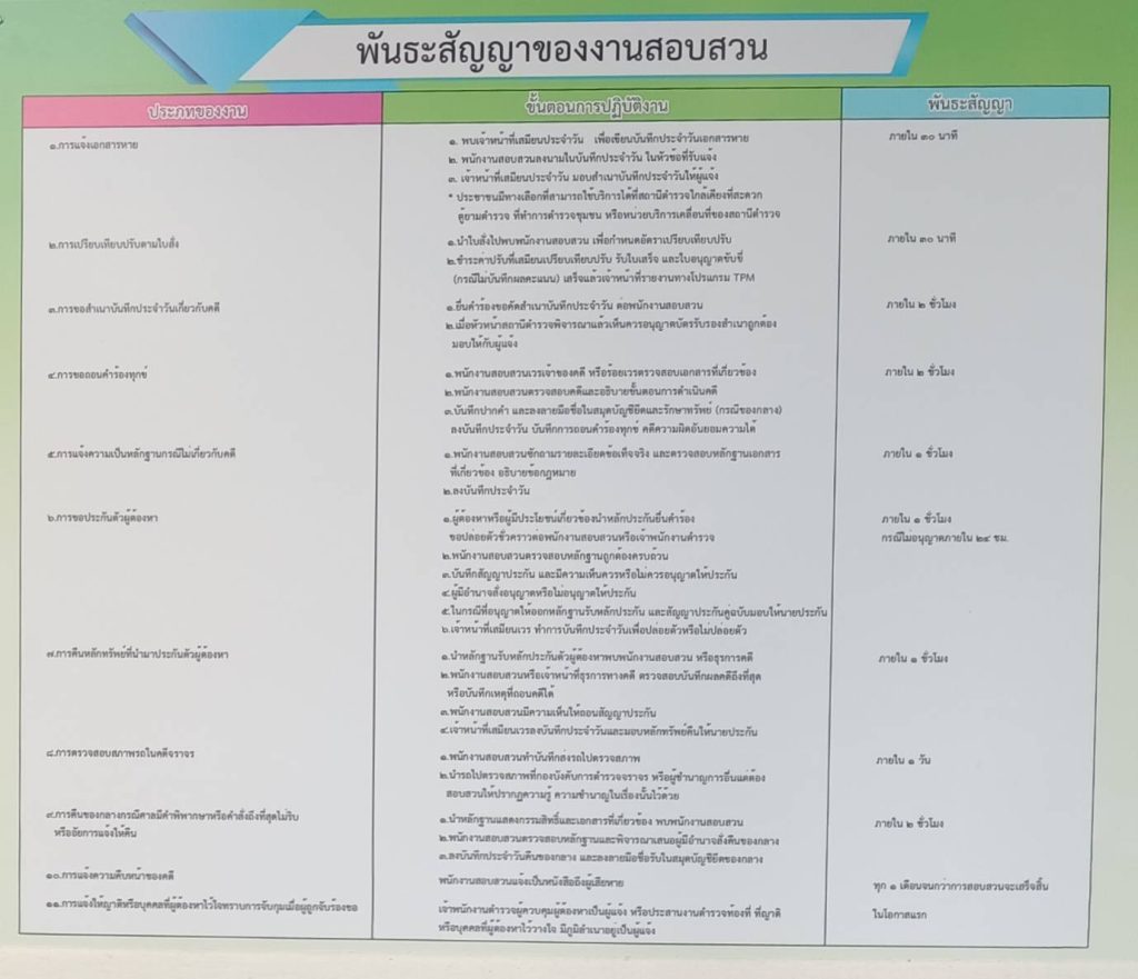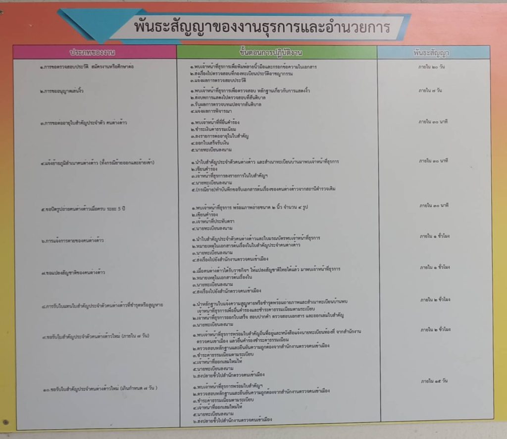 ติดตั้งป้ายพันธะสัญญาขั้นตอนและระยะเวลาการบริการประชาชน ที่มีความสมบูรณ์และผู้มาติดต่อราชการสามารถมองเห็นได้ชัดเจน