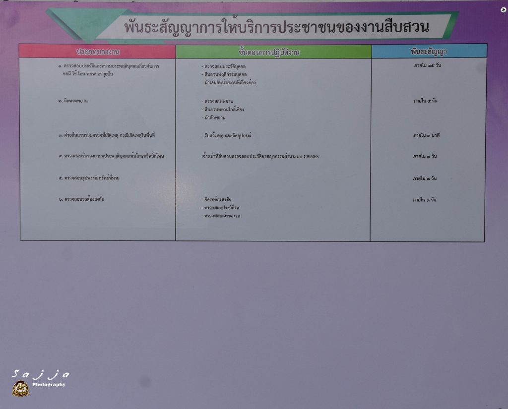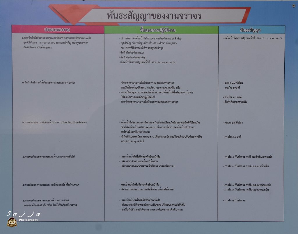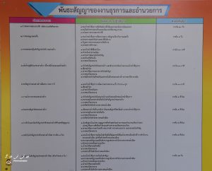 ติดตั้งป้ายพันธะสัญญาขั้นตอนและระยะเวลาการบริการประชาชน ที่มีความสมบูรณ์และผู้มาติดต่อราชการสามารถมองเห็นได้ชัดเจน