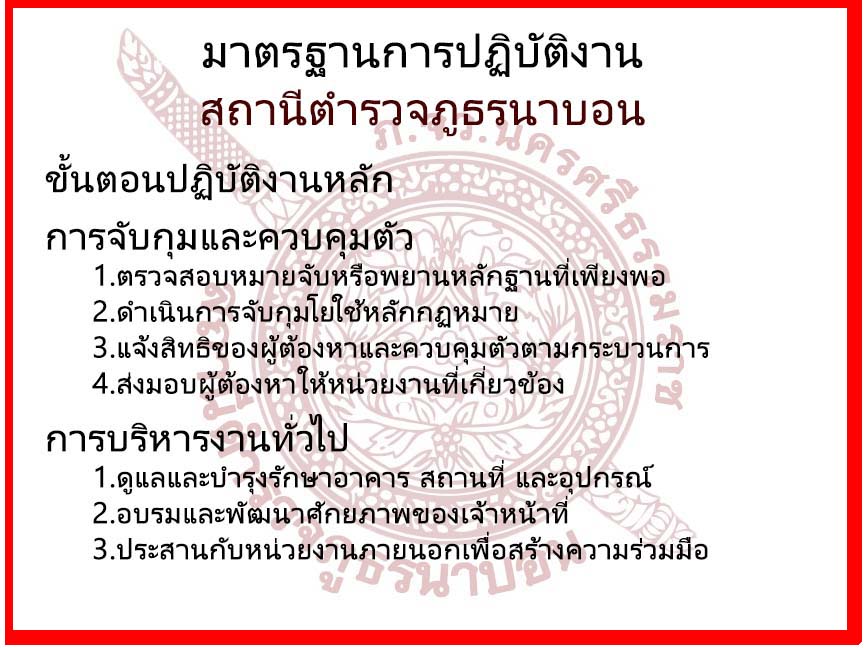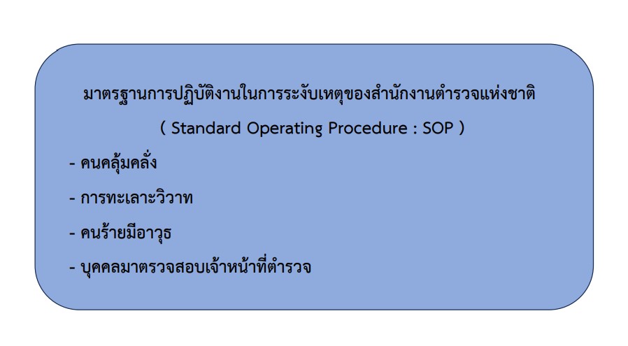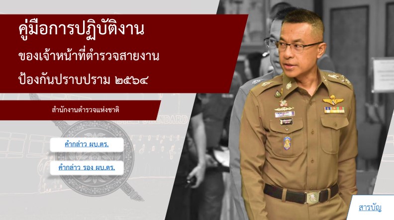 คู่มือการปฏิบัติงานสำหรับเจ้าหน้าที่ 1.คู่มือปฏิบัติงานป้องกันและปราบปราม 2.คู่มือปฏิบัติงานจราจร 3.คู่มือปฏิบัติงานสอบสวน 4.คู่มือปฏิบัติงานอำนวยการ 5.แบบฝึกพระราชทาน 6.ระเบียบเกี่ยวข้องกับการปฏิบัติหน้าที่ มาตรฐานขั้นตอนการปฏิบัติงานที่ถูกกำหนดขึ้นภายในองค์กร เพื่อให้การดำเนินงานเป็นไปอย่างมีประสิทธิภาพ สม่ำเสมอ และสอดคล้องกับนโยบายขององค์กร คู่มือการปฏิบัติงานของเจ้าหน้าที่ตำรวจสายงานป้องกันปราบปราม 2564 คลิก คู่มือปฏิบัติงานสอบสวน คลิก คู่มือการปฏิบัติมาตรฐานสำหรับเจ้าหน้าที่ตำรวจ สายตรวจและเจ้าหน้าที่ตำรสจผู้ประสบเหตุ 2559 คลิก มาตรฐานการปฏิบัติงานในการระงับเหตุของสำนักงานตำรวจแห่งชาติ คลิก