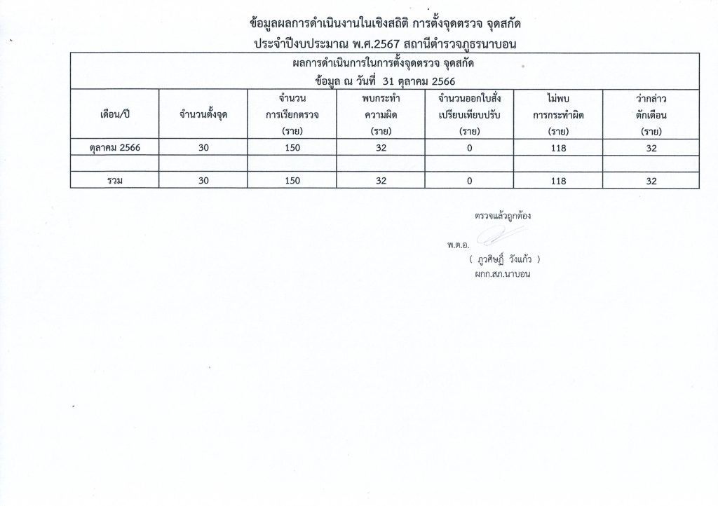 ข้อมูลผลการดำเนินงานในเชิงสถิติในการตั้งจุดตรวจ จุดสกัด เดือนตุลาคม 2566