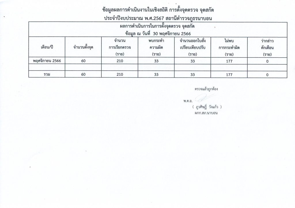 ข้อมูลผลการดำเนินงานในเชิงสถิติในการตั้งจุดตรวจ จุดสกัด เดือนพฤศจิกายน 2566