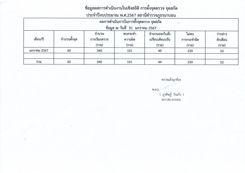 ข้อมูลผลการดำเนินงานในเชิงสถิติในการตั้งจุดตรวจ จุดสกัด เดือนมกราคม 2567
