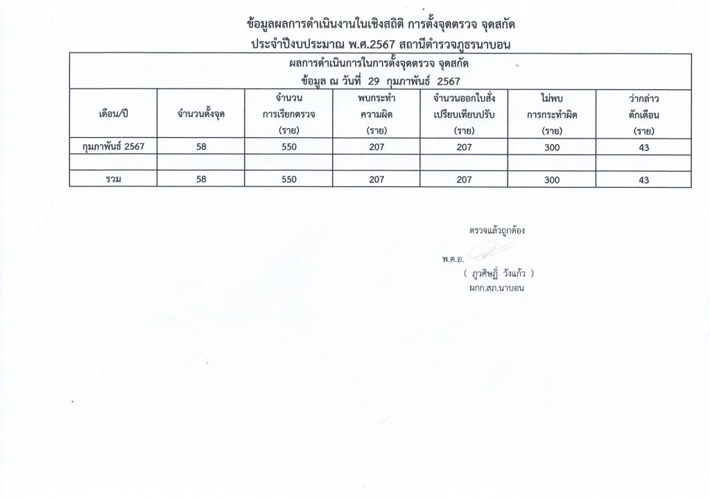 ข้อมูลผลการดำเนินงานในเชิงสถิติในการตั้งจุดตรวจ จุดสกัด เดือนกุมภาพันธ์ 2567