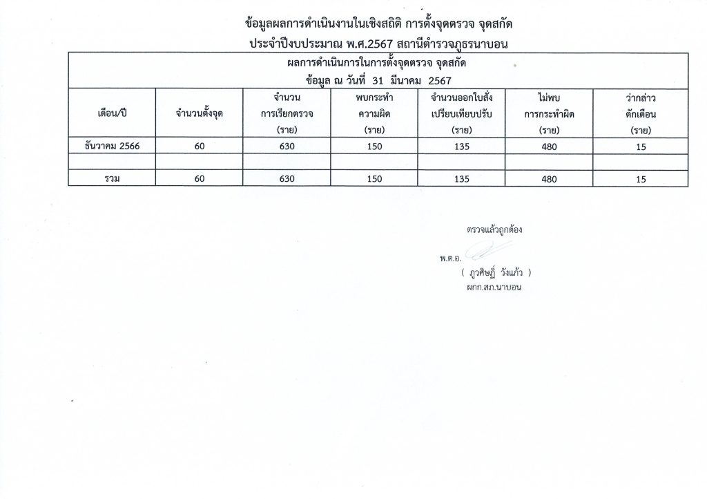 ข้อมูลผลการดำเนินงานในเชิงสถิติในการตั้งจุดตรวจ จุดสกัด เดือนมีนาคม 2567